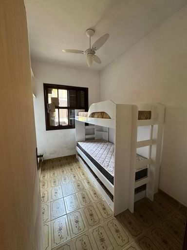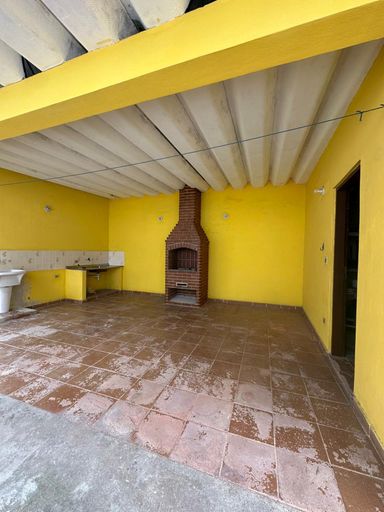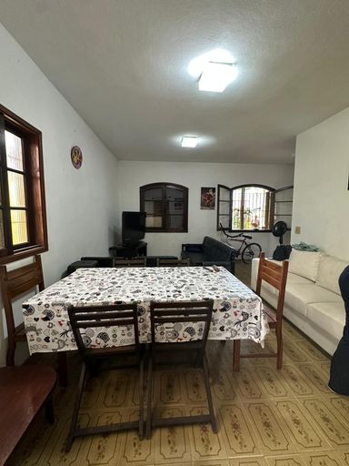 A casa é composta por quatro dormitórios, sala de estar e cozinha. A área de apoio conta com dois banheiros internos, além de uma área de serviço externa equipada com despensa e banheiro auxiliar. O imóvel dispõe de garagem para três veículos.