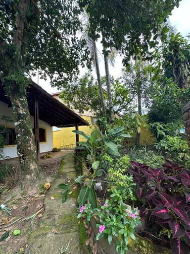 O terreno possui um recuo frontal com vegetação densa, incluindo árvores frutíferas e orquídeas, o que contribui para a ventilação natural da propriedade.